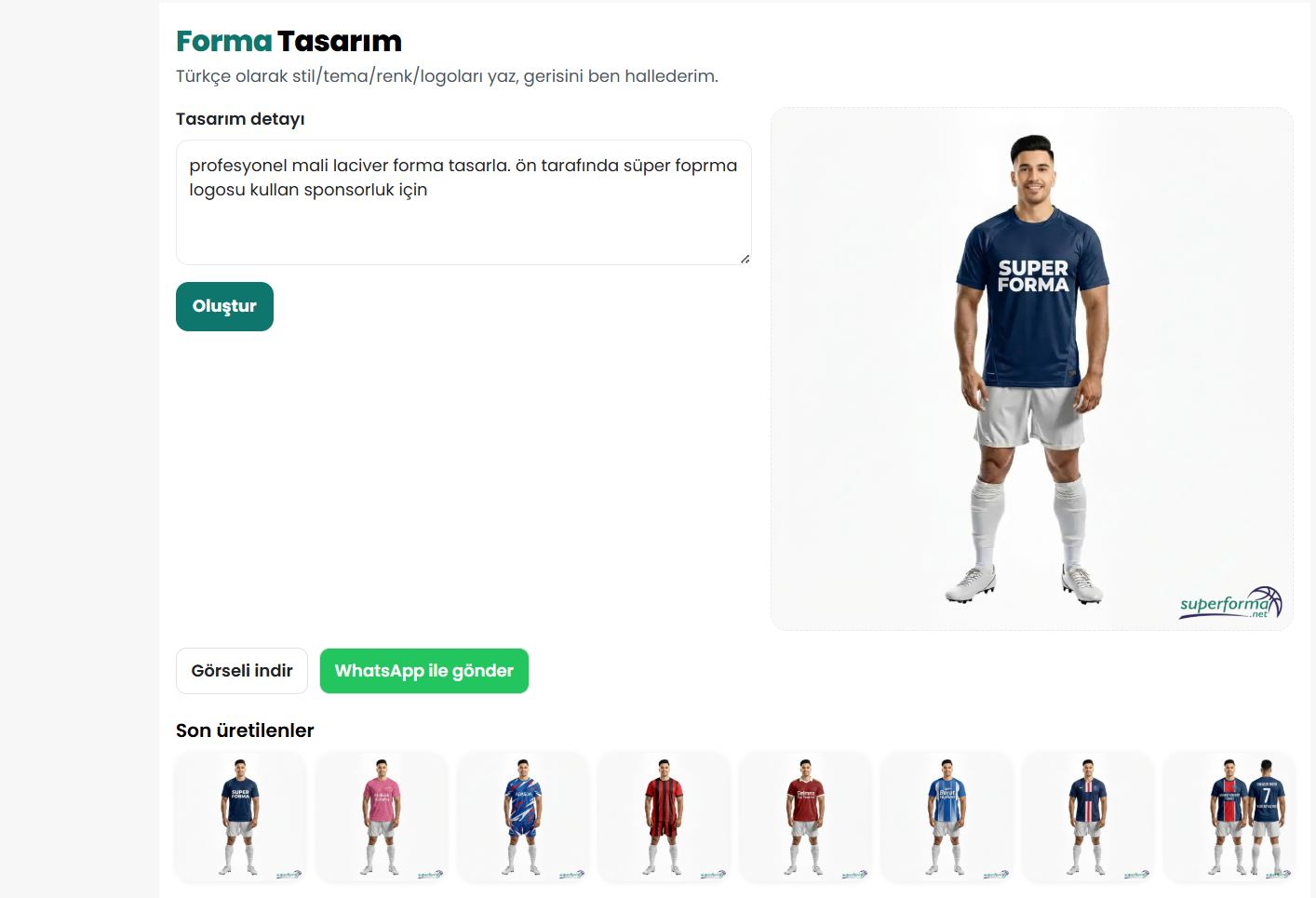 Superforma’nın yapay zeka destekli forma tasarlama aracı, Türkiye’de halı saha formalarına özel geliştirilmiş tek platformdur. Kendi fabrikasında üretim yapan Superforma, tasarım ile üretim sürecini tek çatı altında birleştiriyor.