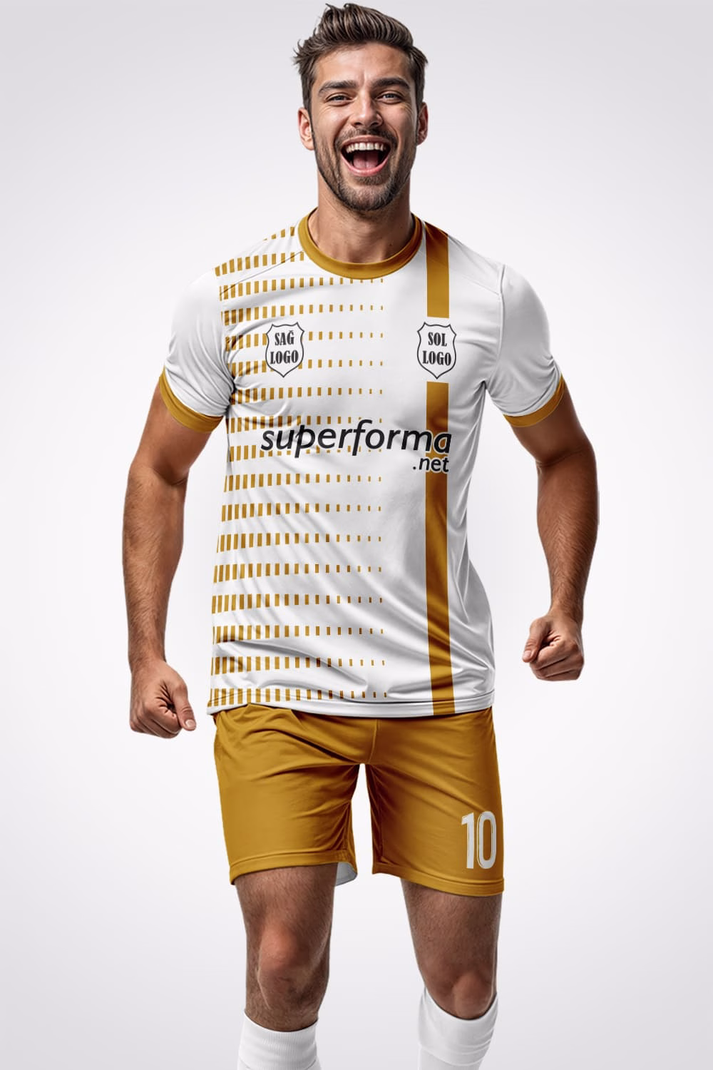 Beyaz Gold Forma, sadece şık görünmekle kalmaz; aynı zamanda takımınıza güçlü bir karakter kazandırır. Dış görünüşünüzle rakiplerinize üstünlük kurmak istiyorsanız bu model tam size göredir.