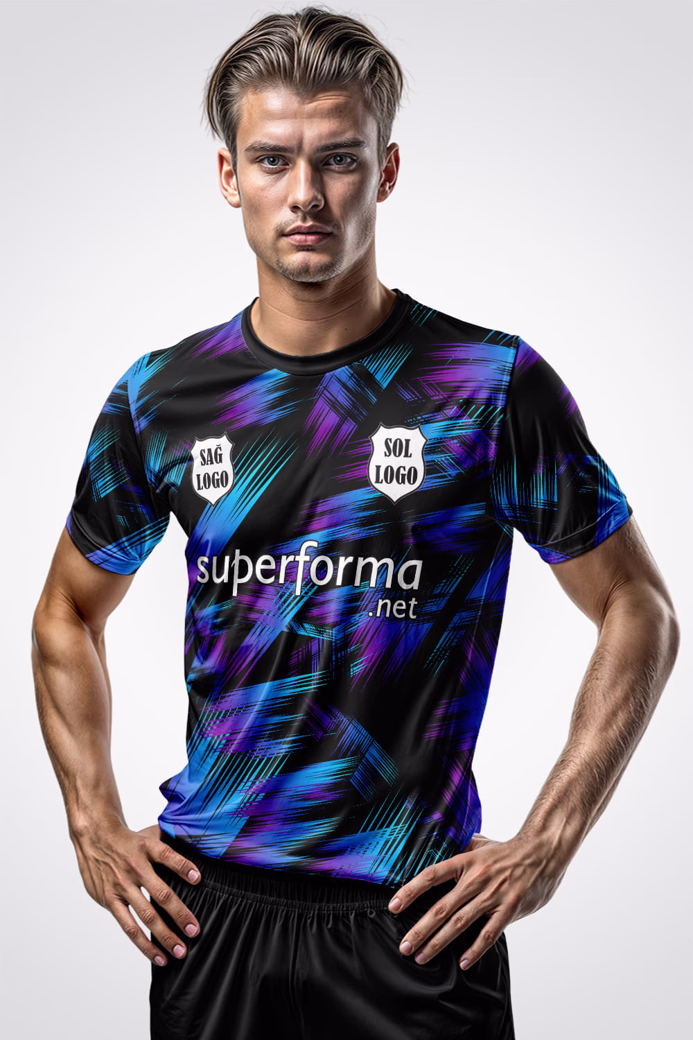 Mavi Siyah Asimetrik Halı Saha Forma modeli, geleneksel forma anlayışını modern çizgilerle yeniden tanımlayan özgün bir tasarımdır. Mavinin soğukkanlı duruşu ile siyahın güçlü ve iddialı tonu, asimetrik tasarım detaylarıyla birleşerek hem estetik hem de dinamik bir görünüm ortaya çıkarır. Halı saha maçlarında hem performansı hem de tarzı önemseyen takımlar için bu forma, sıradışı bir tercih olacaktır.