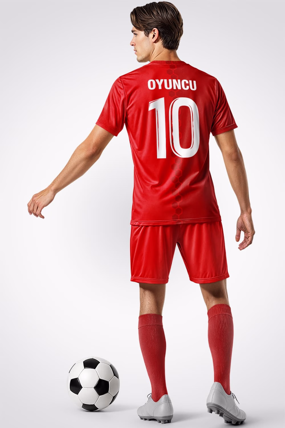 Kırmızı zemin üzerine uygulanacak beyaz, siyah veya altın sarısı yazılar hem estetik açıdan başarılı hem de sahada okunabilirlik açısından idealdir. Takımınıza özel forma tasarımınızı oluşturmak ve siparişinizi başlatmak için bizimle iletişime geçebilirsiniz: 0531 242 7762