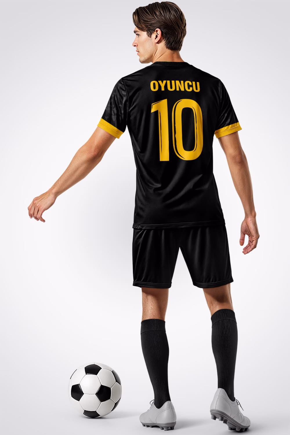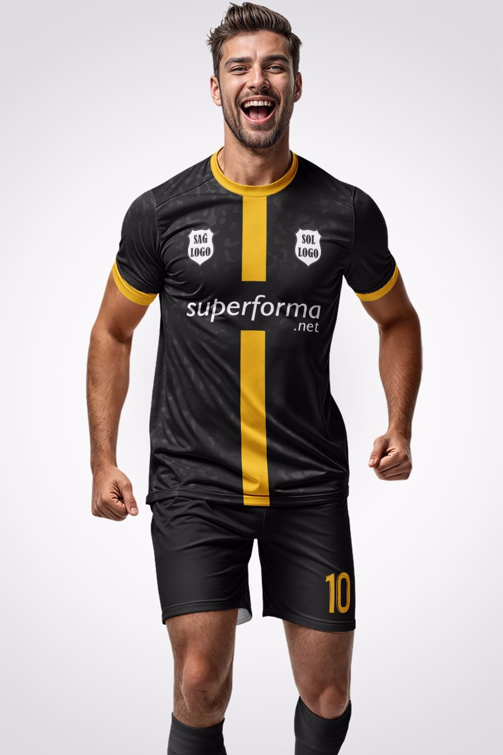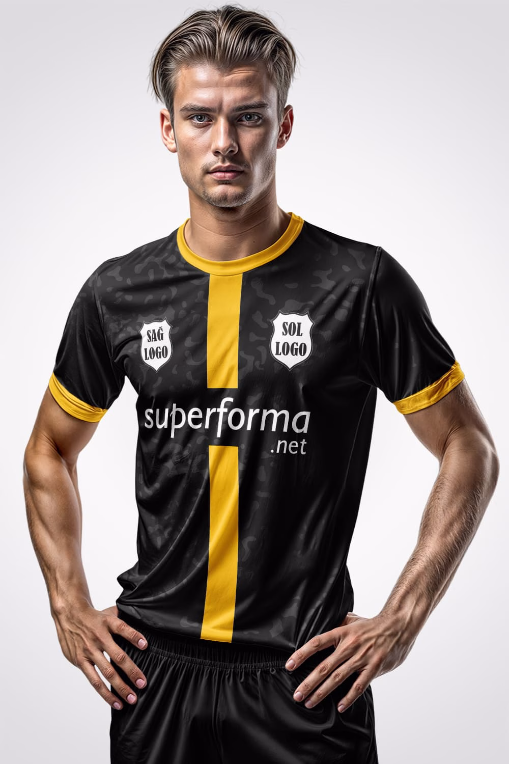 Sahada farkınızı koyu renklerin asaleti ve sarı çizgilerin enerjisiyle gösterin. Şimdi sipariş verin, takımınıza özel formalarla maçlara iddialı çıkın.