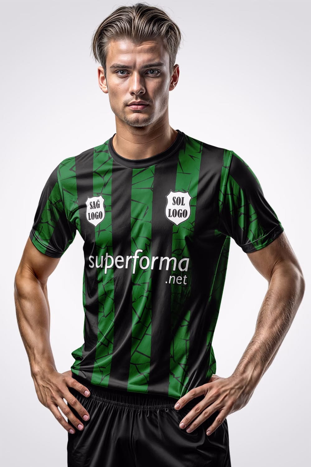 Yeşil Siyah Çubuklu Halı Saha Forma, futbol geçmişinin ikonik tasarımlarını geleceğe taşıyan bir modeldir. Her çizgisiyle güçlü bir mesaj verir: Takımınız, organize, tutkulu ve özgün bir duruşa sahiptir.